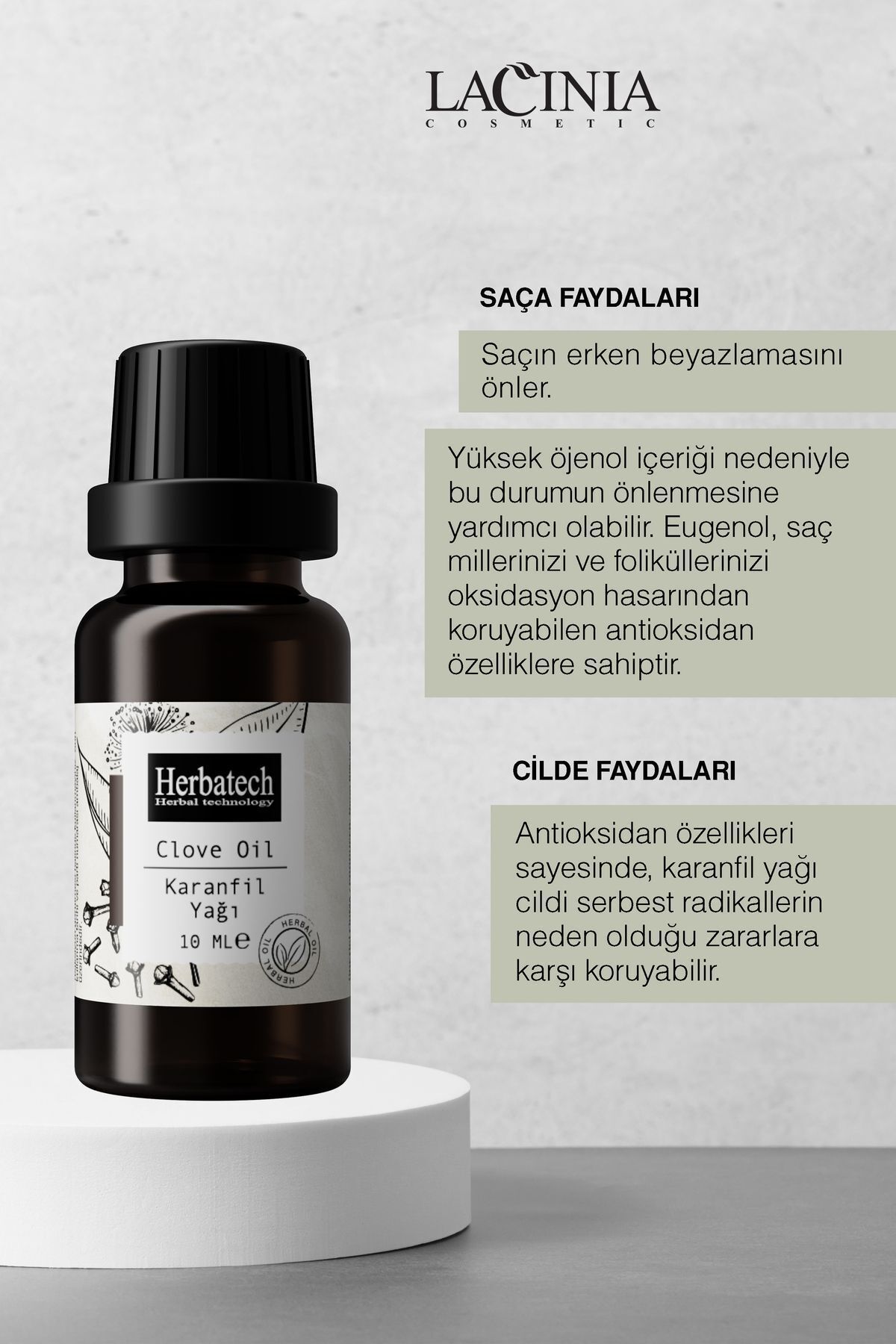 Cilde faydaları: Antioksidan özellikleri sayesinde, karanfil yağı cildi serbest radikallerin neden olduğu zararlara karşı koruyabilir; Saça faydaları: Seçin erken beyazlamasını engelleyebilir; Yüksek öjenol içeriği nedeniyle bu durumun önlenmesine yardımcı olabilir; Eugenol, saç millerinizi ve foliküllerinizi oksidasyon hasarından koruyabilen antioksidan özelliklere sahiptir; Karanfil yağı, sağlık ve güzellik alanında geniş bir yelpazede faydalar sunar; özellikleri sayesinde baş ağrısı ve diş ağrısı gibi rahatsızlıkları hafifletir; Ayrıca, sindirimi destekler ve mide problemlerini giderir; Cilt için de faydalıdır, akne ve sivilceye karşı etkilidir, cildi temizler ve gençleştirir; Aromaterapi uygulamalarında da kullanılır, stresi azaltır ve zihinsel olarak rahatlatıcı bir etki sağlar; ;;