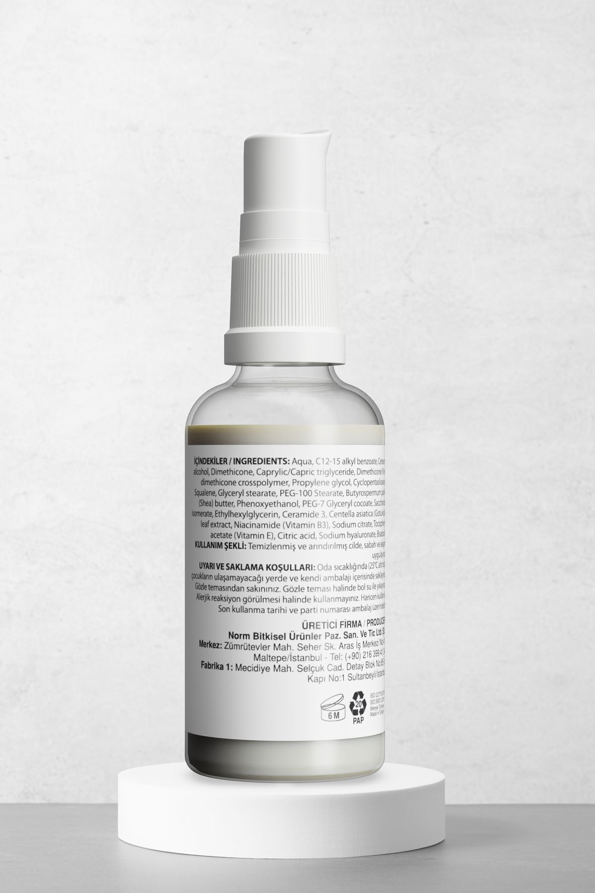 - İçerik YazısıAktif Bileşenler : Squalene, Butyrospermum parkii (Shea) butter, Ceramide 3, Centella asiatica (Gotu kola) leaf extract, Niacinamide (Vitamin B3), Tocopheryl acetate (Vitamin E), Hyaluronic acid, Bisabolol