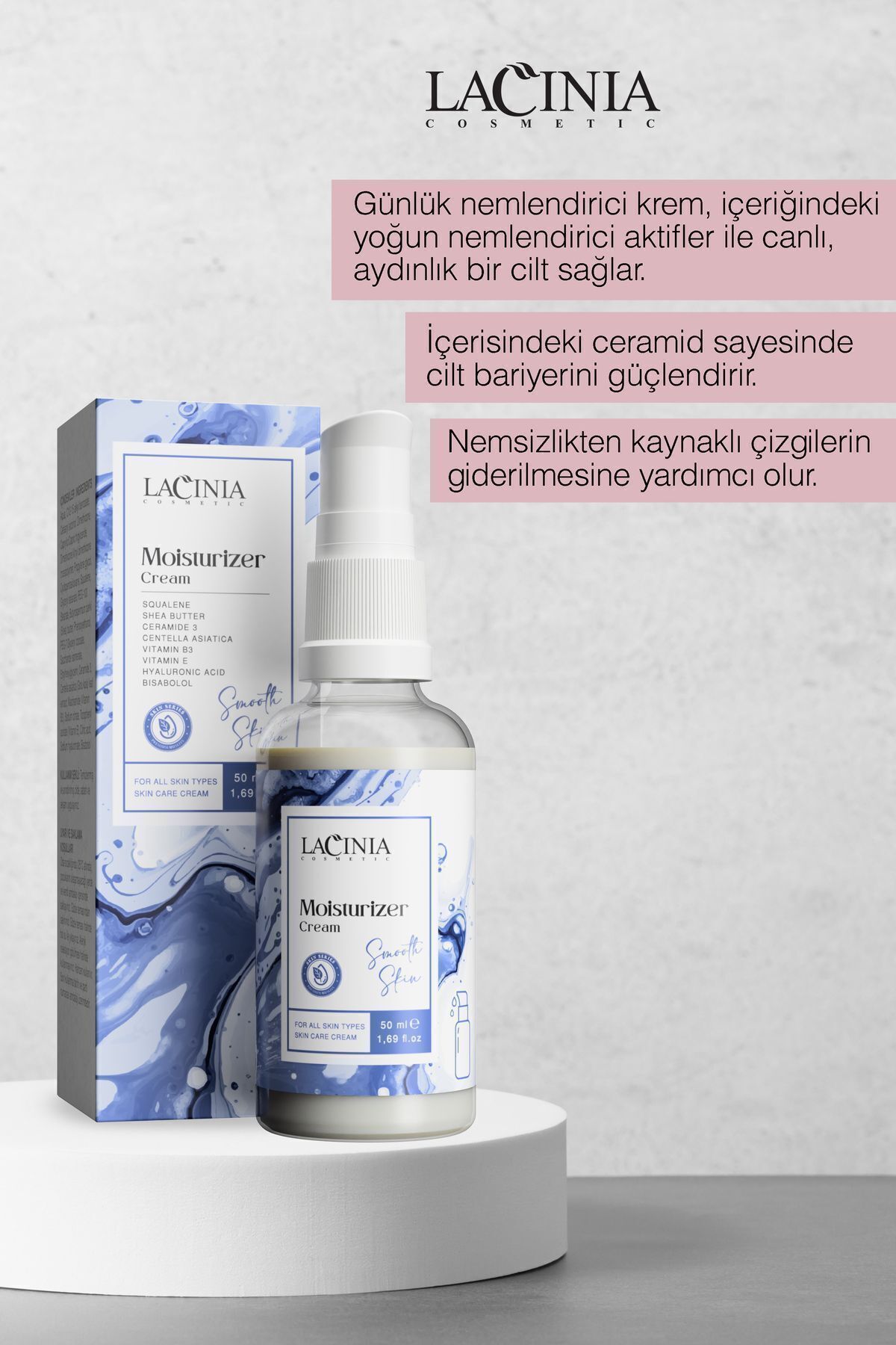 Günlüknemlendirici krem, içeriğindeki yoğun nemlendirici aktifler ile pürüzsüz,canlı, aydınlık bir cilt sağlar. ; Nemsizlikten kaynaklı çizgilerin giderilmesineyardımcı olur. ; Tüm cilt tipleri için uygundur. ; Moisturizer (Nemlendirici) Cream Moisturizer Cream, cildinizi nemlendirirken aynı zamanda korur ve besler. ; Hafif formülü hızla emilir ve cildinize anında canlılık kazandırır. ; Derinlemesine nemlendirici özellikleriyle kuru ve mat bir cildi canlandırır, esneklik kazandırır. ; Vitamin ve antioksidanlarla zenginleştirilmiş içeriği sayesinde cildin yaşlanma belirtilerini azaltır ve elastikiyetini artırır. ; Güneşin zararlı etkilerine karşı koruma sağlarken, cildin doğal bariyerini güçlendirir. ; Düzenli kullanımda daha yumuşak, pürüzsüz ve sağlıklı bir cilt elde etmenize yardımcı olur.;