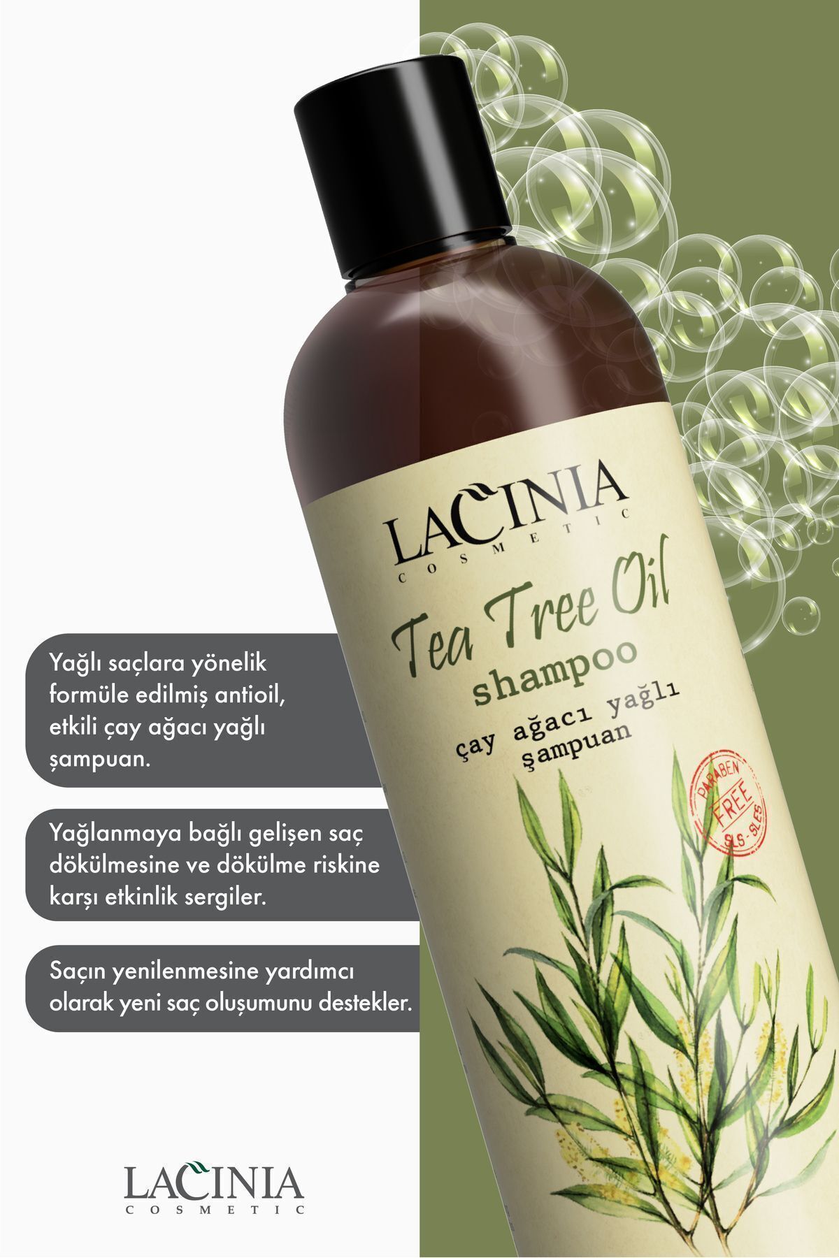 Çay ağacı yağı, etkileri sayesinde problemli saç derisinin bakımında etkili aktifdir; B5 vitamini ve aynısafa özü sayesinde kuru saç derisinin onarımına yardımcı olur ve doğal nemlendirici aminoasit ile saç derinizi nemlendirir; Saç dökülmesine ve dökülme riskine karşı mikro dolaşıma yardımcı olur; Aynı zamanda sebum düzenleyici ektisi bulunmaktadır; Kepek önleyici aktif sayesinde kepekli saç derisinden kurtulmanıza yardımcı olacaktır; Günlük kullanım için uygundur; Kullanım Şekli: Bir miktar şampuanı ıslak saça masaj yaparak uygulayınız; 2; 3 dakika beklettikten sonra bol su ile durulama yapınız; Bu işlemi her yıkamada 2; 3 defa uygulayınız; Aktif içerikler: Melaleuca alternifolia (Tea tree) oil (Çay ağacı yağı);