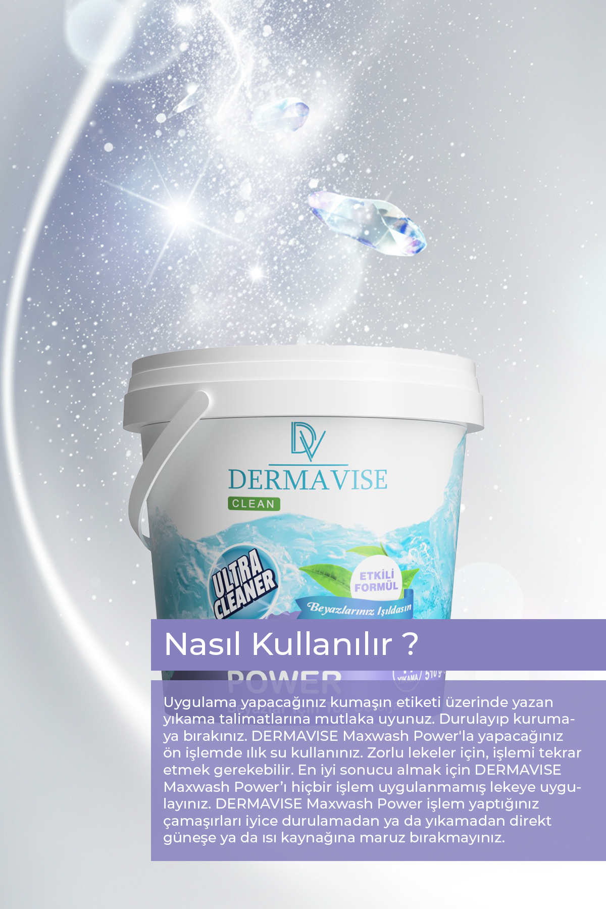 Maxwash Power Beyazlar İçin Toz Deterjan 510 gr DERMAVISE Maxwash Power ile en iyi sonuç nasıl elde edilir? Uygulama yapacağınız kumaşın etiketi üzerinde yazan yıkama talimatlarına mutlaka uyunuz.; Durulayıp kurumaya bırakınız.; DERMAVISE Maxwash Power'la yapacağınız ön işlemde ılık su kullanınız.; Zorlu lekeler için işlemi tekrar etmek gerekebilir.; En iyi sonucu almak için DERMAVISE Maxwash Power hiçbir işlem uygulanmamış lekeye uygulayınız.; DERMAVISE Maxwash Power işlem yaptığınız çamaşırları iyice durulamadan yada yıkamadan direkt güneşe ya da ısı kaynağına maruz bırakmayınız.; Çamaşır Makinesinde Yıkama: Kurumuş ve zor lekeler için, deterjan gözüne normal deterjan ile birlikte 1 ölçek DERMAVISE Maxwash Power koyunuz ve çamaşırlarınızı her zamanki gibi yıkayınız.; Suya Bastırma: 1 ölçek DERMAVISE Maxwash Powerı 4 litre sıcak suda (en fazla 40°C) iyice çözün.; Daha sonra çamaşırlarınızı bu suda bekletin.; Çamaşırlarınızdaki kir ve lekeler kolayca çözülmesi için yıkamadan önce çamaşırlarınızı DERMAVISE Maxwash Power'lı ılık suya bastırınız.; Yalnızca beyaz çamaşırlarınızı en fazla 6 saate kadar hazırladığınız suda bekletiniz.; Çamaşırlarınızı sudan çkardıktan sonra makinede yıkayınız veya iyice durulayınız.; Renkli çamaşırlarda kullanmayınız Durulama; Bastırma ve yıkama işleminden sonra çamaşırlarınızı temiz su ile durulayınız.; Çamaşır Suyu Kullanmanıza gerek Yok ! Çamaşır suyu kullanmak istediğinizde bunu DERMAVISE Maxwash Power'ın esas yıkama suyuna karıştırmayınız çünkü bu işlem DERMAVISE Maxwash Power'ın esas yıkama gücünü azaltır.; DERMAVISE Maxwash Power, Çamaşırların lekelerini çıkarmakta etkilidir .; Dokuların derinliğine ulaşarak beyaz çamaşırlarınızın grileşmesini önler.; Defalarca yıkamaya rağmen çamaşırların parlak beyazlığını korur.;